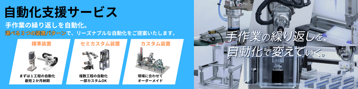 「手作業の繰り返しを自動化」をコンセプトに、お客様のラインに適したリーズナブルな装置をご提案いたします。