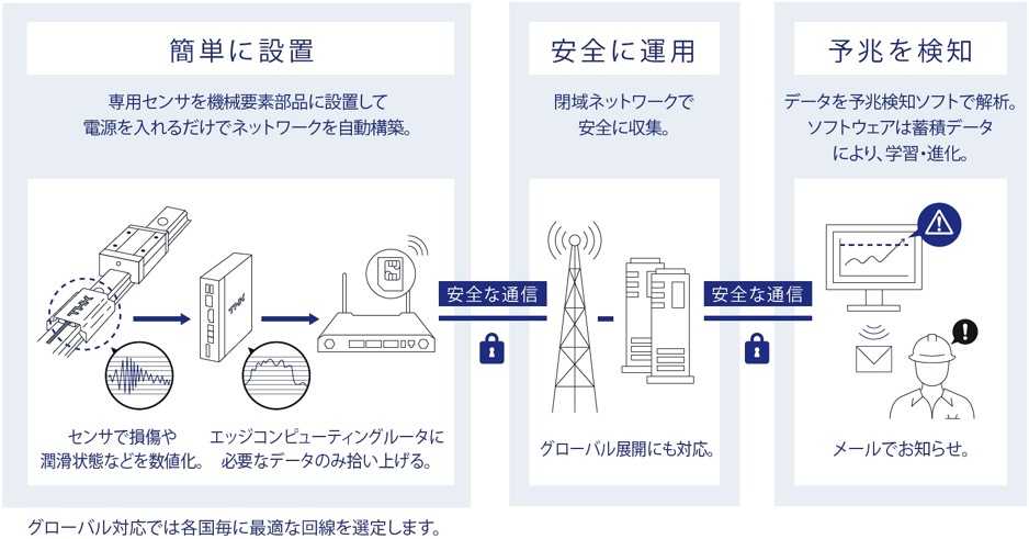 機械要素部品の状態を”見える化”しませんか?既に現場で稼働している装置の機械要素部品に後付けができるよう、センサの設置も非常に簡単に行うことができます。機械要素部品のトップメーカーとして蓄積してきたデータから、独自のアルゴリズムを開発。部品の状態を見える化できるので、”いつもとちがう”を知ることができます。