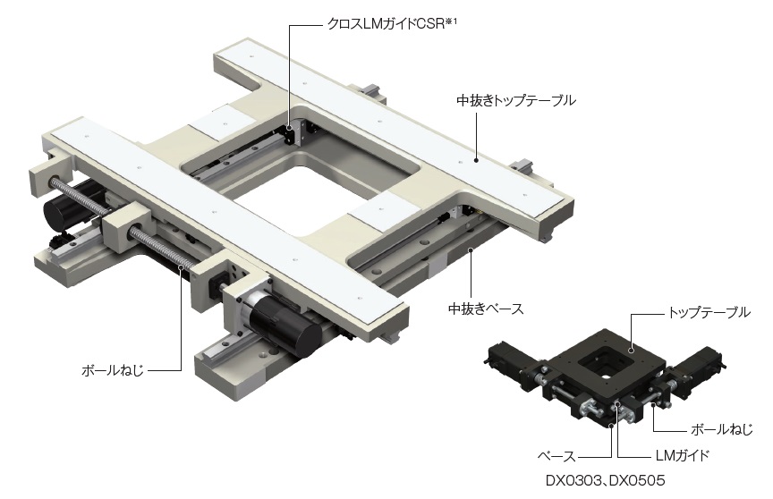 中央を中抜き構造とするため、案内部にクロスLMガイドCSRを使用し、駆動ボールねじを外側に配置したXYステージです。
