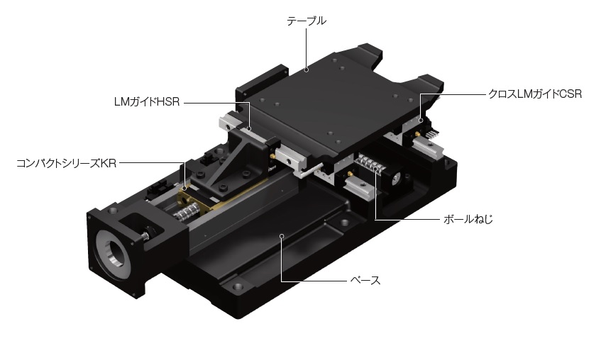X軸の駆動部は、直動案内のLMガイドと駆動用ボールねじを一体化した、省スペース、高剛性、高精度なKRを採用しています。