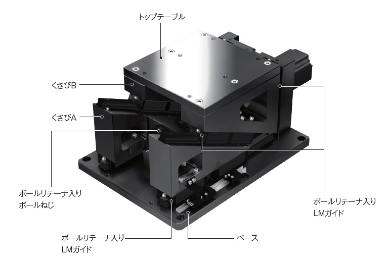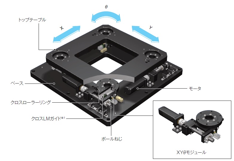 XYθモジュールを構成しているクロスLMガイドとクロスローラー リングには予圧を与えてあり、高精度で剛性の高い構造です。