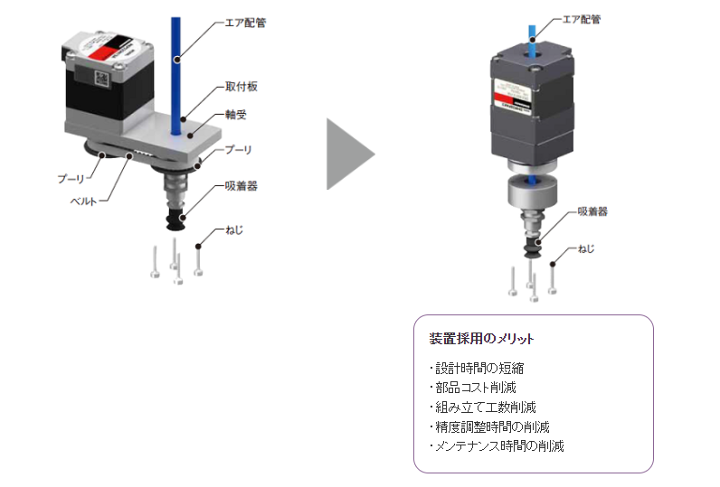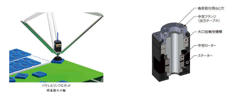中空穴に配管・配線を通すことができ、装置の簡素化、小型・省スペース化に貢献します。 中空フランジは、直接負荷を取り付けることができます。 可動部周辺の部品点数削減に貢献します。