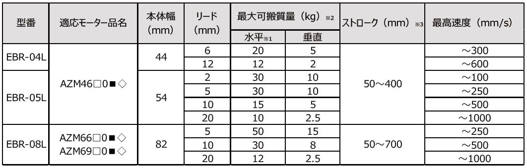 ※2 定格推力、最大可搬質量の値は、アクチュエータ本体の許容値であり、実際の推力や可搬質量は、お客様がお使いになるモータにより制限されることがあります。