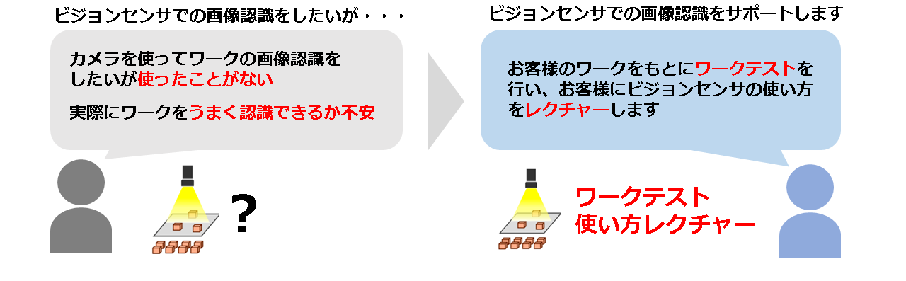 というお客様のために、お客様のワークをもとに、弊社取り扱いのあるカメラ(ビジョンセンサ)を用いてのワークテストや、