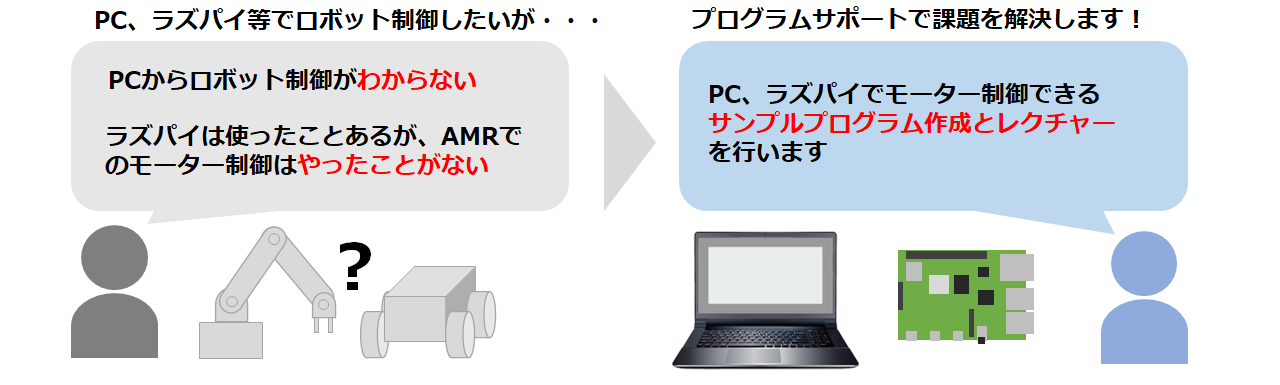 本サービスは、お客様のやりたい動きに対してロボット、モータ制御の部分のサンプルプログラムを作成と、