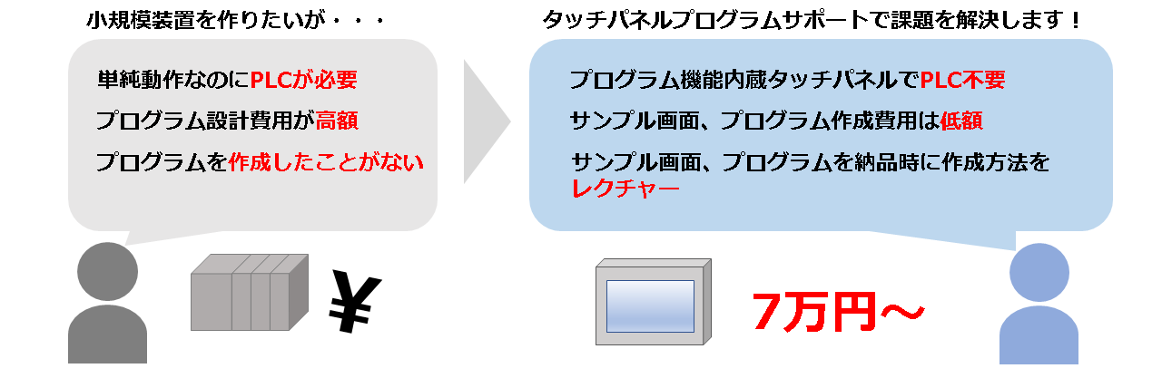 本サービスはプログラム機能搭載のタッチパネルを使ったシステムで、お客様の装置にあわせたサンプルの画面やプログラムを作成いたします。