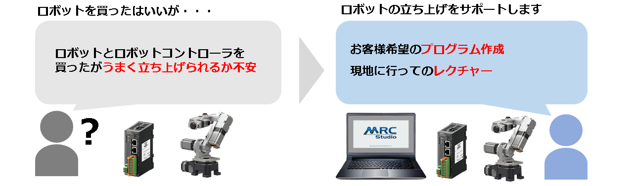 | ④レクチャー | MRC Studioを使用してのOVRロボットのセットアップ、基本的なプログラム作成方法をご説明。その後、希望の動きに合わせたプログラムをお客様と一緒に作成します。 ※レクチャー前にはロボットの設置、電気配線等はお客様にてお願いします。 |
