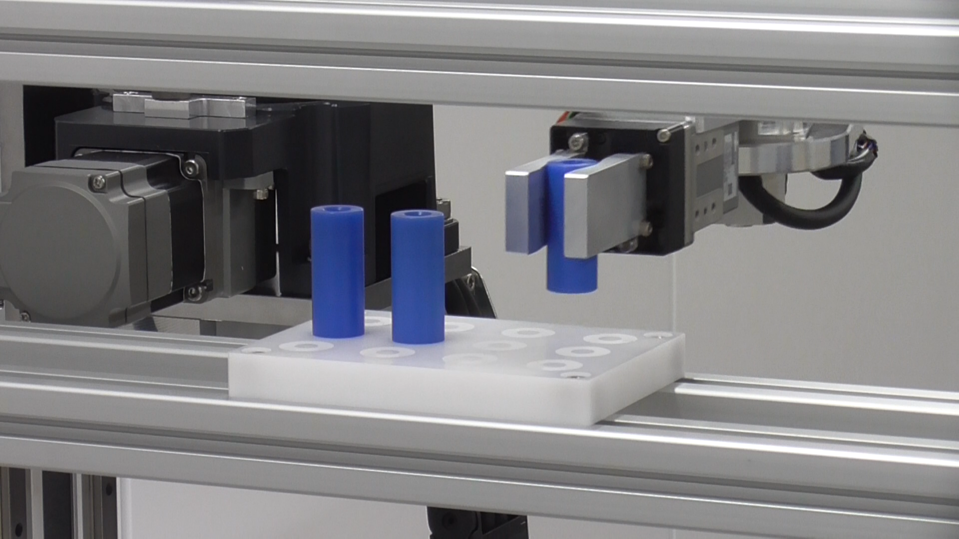 円筒形のワークをピックアップして上から下、下から上に搬送を行うデモ機です。