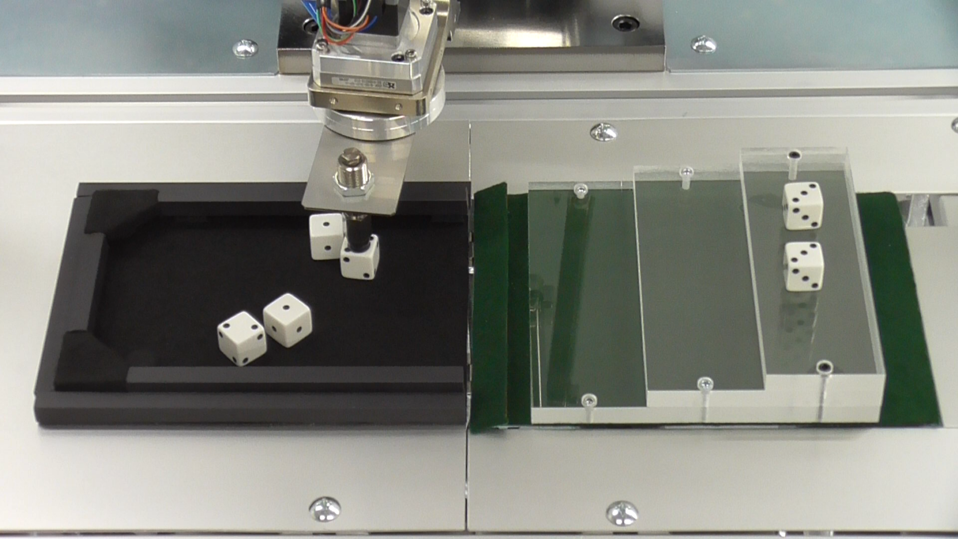 その情報をもとにロボットがサイコロの位置まで移動し、パレタイジングの機能でサイコロを台に並べます。
