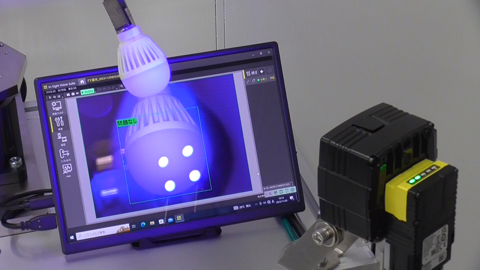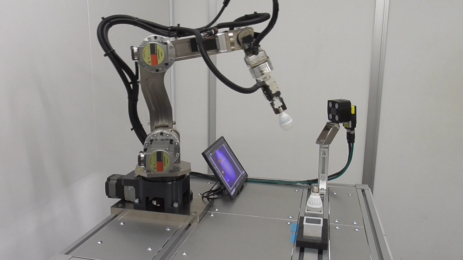 電球をロボットでピックアップし、固定されたカメラの前まで持って行って画像検査するデモ機です。