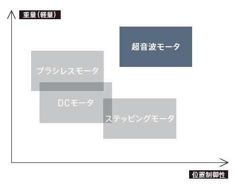 同サイズの超音波モータ、DCモータ、ブラシレスモータ、ステッピングモータの位置制御性と重量(軽量)の関係にフォーカスした領域図です。超音波モータは他のモータに比べ、軽量で高い位置制御性を有するという特徴を持ちます。回転部の重量が軽いためイナーシャが小さく、駆動信号が停止すると瞬時に摩擦力により静止するため、精密な位置決めが可能です。 小型・静音でありながら、薄型で高トルク、高保持力を持ちながら精密な位置決めが可能なモータです。