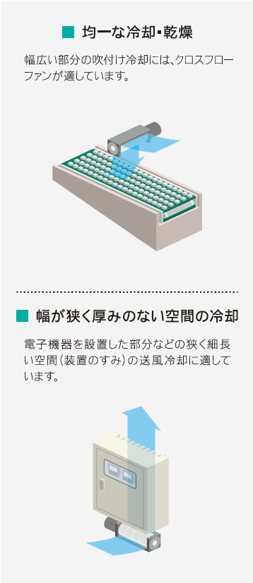 風量の大きい送風が行えるプロペラファン、均一に幅広い送風を行うクロスフローファン、静圧が多きく局部冷却に適したブロワなど、熱に関するあらゆる対策をおこなえる製品を取り揃えています。また、高風量&高静圧な二重反転ファンや、風向きを切り替えられます。リバーシブルフローファン、その他 耐環境ファン(防水・防油・耐温)等、様々な商品を用意しています。