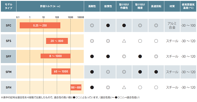 サーボモータ用途に開発した、超高剛性の金属板ばね式カップリングで、この方式は、ねじれ方向に硬く、こじり方向・段違い方向・軸方向にやわらかいというすぐれた性質を持っており、エレメントとなる板ばねは、最新の有限要素法による徹底的な解析で、この上ない理想的形状を追求しました。ハブの材質に高力アルミ合金を採用した小型軽量のSFCモデルと本体材質に炭素鋼を採用しさまざまなバリエーションが選べるSFSモデル、工作機械の主軸・送り軸用途に開発したSFM・SFFモデルと用途に応じて豊富なラインアップを取り揃えています。