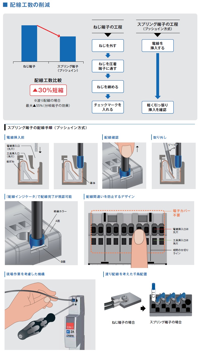 メンテナンス性:定期的なねじの増し締め不要。設置、定期点検等の作業が軽減。使っていない端子のねじが