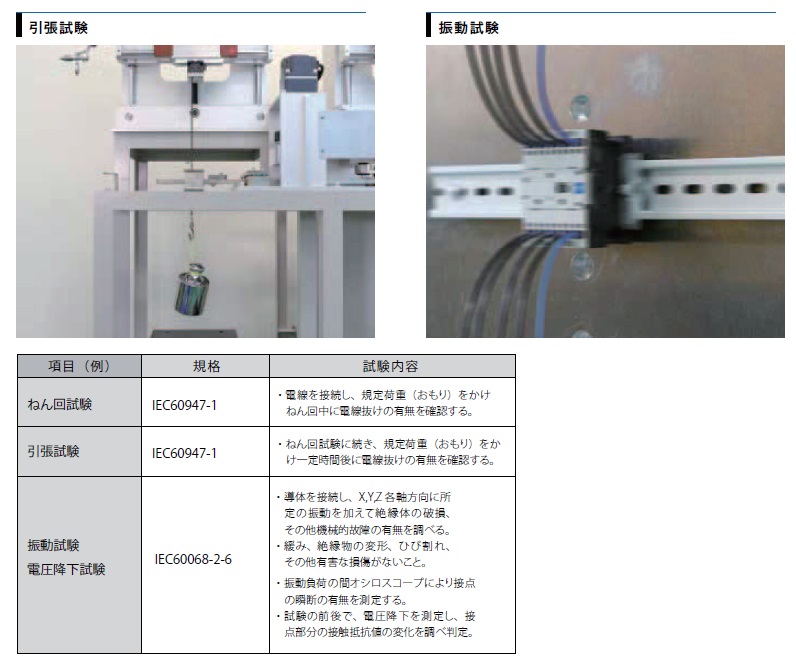 IEC規格で要求される「ねん回試験」「引張試験」「振動試験」に対して十分な電線保持力を満たしています。