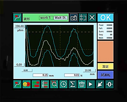 本体は、ロードセルの入力とドライバからのフィードバック信号を取り込んで測定波形を表示します。タッチパネルに設定波形を入力すると、測定波形と比較して良否の判定を行うことができます。測定結果はSDカードに記録され、上位ホストにアップロードすることができます。