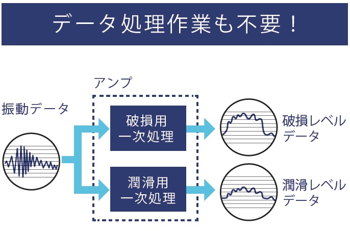 お客様が用意するものは24V電源とLANケーブルのみ。振動センサー(3個)接続ケーブル(最長15m)振動解析アンプ、wifiルーターがパッケージで貸与されます。お客様はセンサーを取り付けるだけです。結線後に電源を入れてすぐにお使いいただけます。毎日適時に自動で診断が行われ、高度のトラブルと診断された場合、登録した担当者にメールが届きます。このタイミングで交換部品を手配してください。メンテナンスのタイミングを最適化し、ドカ停 を未然に防ぐことができます。