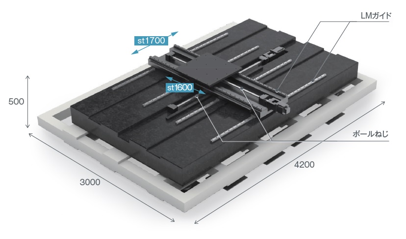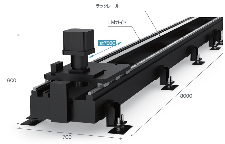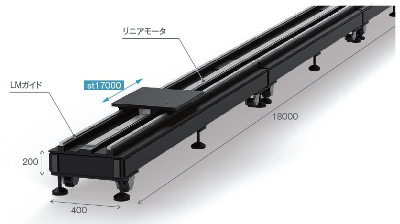 キャスター付き長さ18mの製缶フレームです。分割構造 のため容易に移設が可能です。また、つなぎ部に合わせ面 を設置しているため、簡単に精度復元ができ設置時の調整 時間を大幅に短縮できます。LMガイドのつなぎ部には、 スムーズな乗り移り実現のため、独自のノウハウによる 設計を行っています。 |