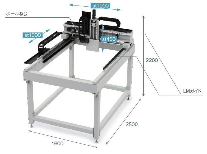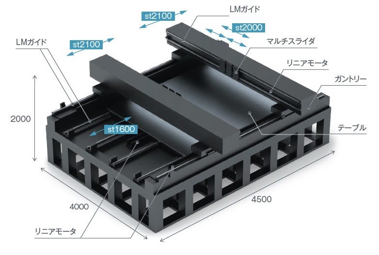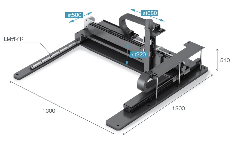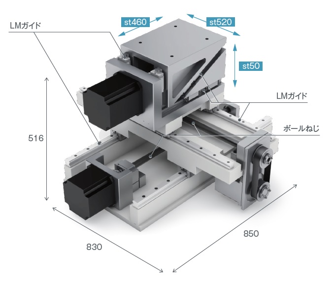 クロスLMガイドCSRを使用した構造により、中間サドルが削除され、さらに2軸のモータを両方とも固定する特殊な構造を採用しました。