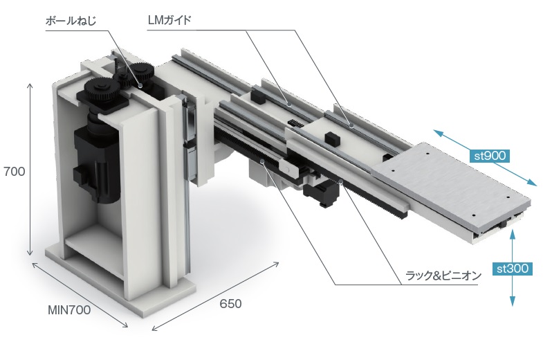 左右のラック&ピニオンを連結することで同期をもたせ、 ガントリの姿勢に安定性を持たせたXYZユニットです。 |