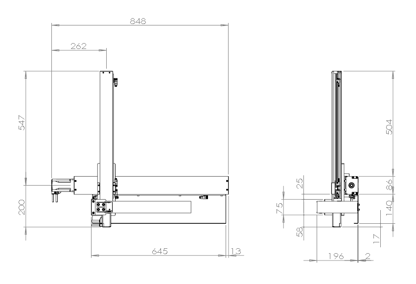 各軸を構成しているSKRシリーズは、LMガイド・ボールねじ・サポートユニットを一体化したコンパクト・高剛性構造なステージです。Y軸剛性が高いため張り出しを長くしてもサポート用LMガイドを必要としません。