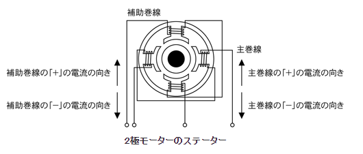 ステータに発生する回転磁界の様子を、2極モータのステータを例に説明します。 インダクションモータには主巻線と補助巻線の2つの巻線があります。