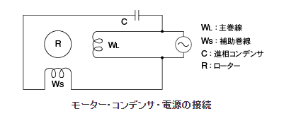 実際の単相電源で使用するインダクションモータでは、以下のような接続をしています。