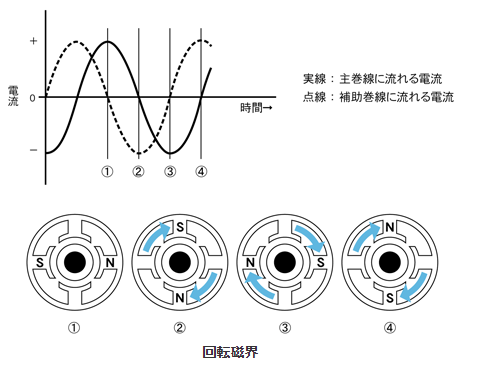 主巻線には電源からの電流がそのまま流れ、補助巻線には進相コンデンサを介して電流が流れます。 このとき、補助巻線に流れる電流は、主巻線に流れる電流に対して、位相が電気角で90°ずれた波形となります。