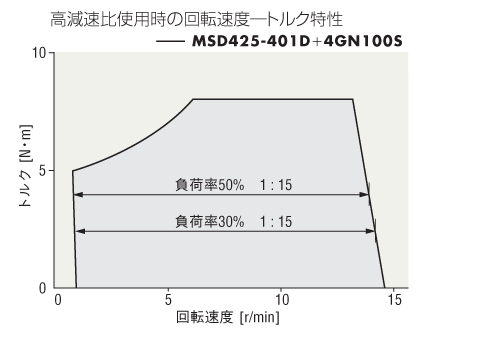 このように、減速比の大きなギヤヘッドと組み合わせて使う場合は、負荷率をあまり考えなくても速度比の大きな運転ができます。
