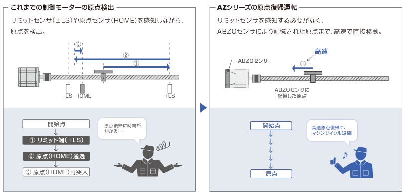 高速原点復帰+原点復帰精度の向上 ABZOセンサなら、原点センサ無しで原点復帰ができます。