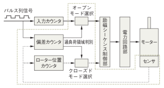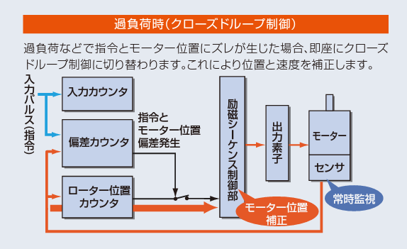 パルス列信号の指令位置に対する、実際のローター回転位置の偏差(遅れ/進み)を偏差カウンタで演算します。 偏差カウンタの演算結果から「過負荷領域」を判別し、オープンモード/クローズドモードの制御を切り替えて運転します。