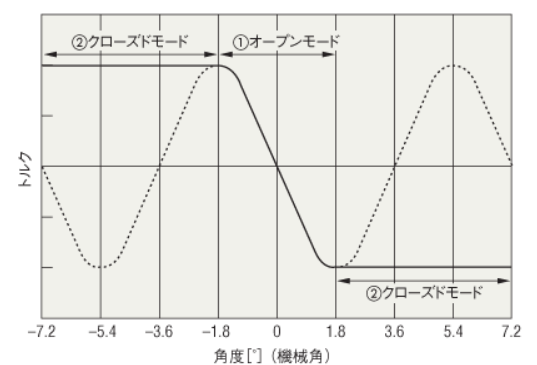 クローズドモードでは、ローター回転位置に対して瞬時最大トルクが発生するようモータ巻線の励磁状態を制御します。 この制御方式によって、角度―トルク特性に不安定点(過負荷領域)はありません。