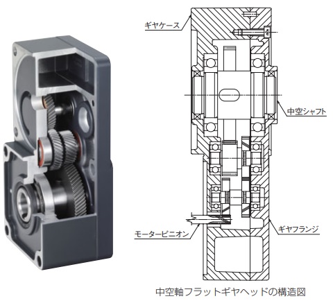 中空軸フラットギヤヘッドの構造は、歯車軸の配置を長手方向に 延ばすことで空間容積を従来の平行軸ギヤヘッドよりも広げてお り、ギヤケース剛性の向上と歯車および軸受の大径化を同時に達 成しました。 これにより平行軸構造のままで出力軸の中空化を達成し、製品の 高許容トルク化、長寿命化を実現しました。 また、平行軸構造であるため直交軸機構に比べて歯車の伝達効率 が高いというメリットもあります。
