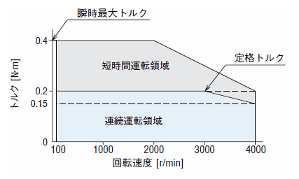ブラシレスモータの場合、下図の例のように100~4000r/minまで定格トルク、起動トルクが一定で(BLFシリーズ、BLEシリーズ、BLHシリーズの場合は、最高回転速度時の出力トルクが定格トルクより下がります。)、ACスピードコントロールモータのように低速でトルクが落ちることがなく、低速から高速まで定格トルクで使用することができます。 ブラシレスモータは、連続運転領域のほかに、短時間運転領域があります。短時間運転領域では、定格トルクの2倍(BLUシリーズ、BLHシリーズの場合は1.2倍)のトルクを発生しますので、慣性負荷を起動する場合に非常に効果的です。なお、短時間運転領域で5秒以上運転を続けると、ドライバの過負荷保護機能がはたらき、モータを自然停止させます。