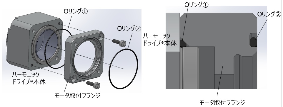 以下の手順にそって組み付けてください。(Oリング、ねじなどの部品一式はハーモニックドライブ®に添付されています。)