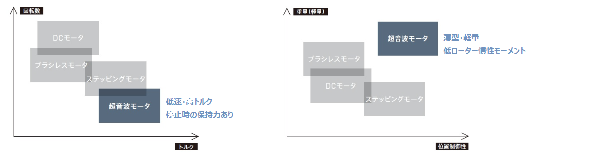 超音波モータは 他のモータに比べ、軽量で高い位置制御性を有するという特徴を 持ちます。 回転部の重量が軽いためイナーシャが小さく、駆動信号 が停止すると 瞬時に摩擦力により静止するため、精密な位置決めが可能です。 小型・静音であり ながら、薄型で高トルク、高保持力を持ちながら精密な位置決めが可能なモータで す。 ※最終的な位置決め精度は外部のセンサ:エンコーダやポテンショメータと 制御コントローラに依存します。 |