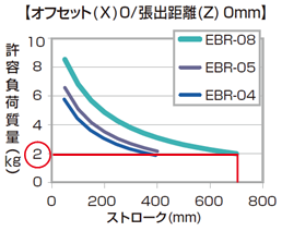 EBR-08タイプの場合、ガイド不要で最大ストローク700mm、質量2kgを搬送することができます。