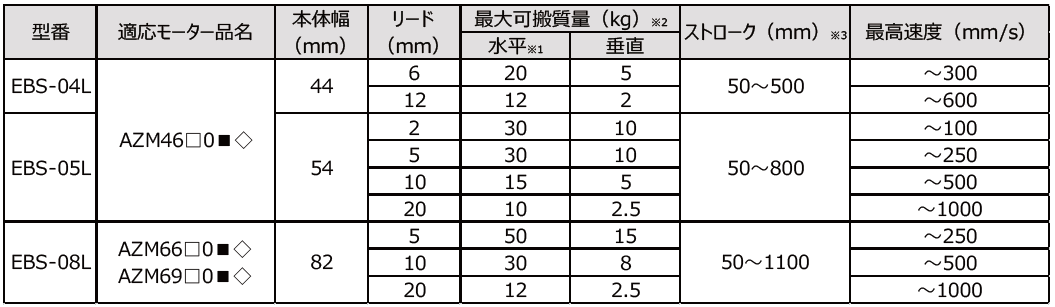 ※2 定格推力、最大可搬質量の値は、アクチュエータ本体の許容値であり、実際の推力や可搬質量は、お客様がお使いになるモータにより制限されることがあります。