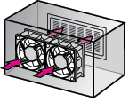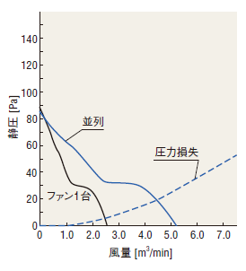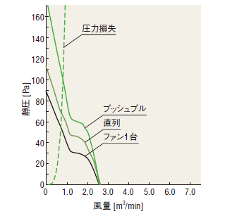 | ファン2台を並列に設置 | ファン2台を直列に設置 | ファンを吸込側と吐出側に設置 (プッシュプル) |