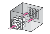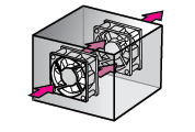 吸込側から吐出側への空気の流れができるた め、効果的な冷却が可能です。 装置内の実装 密度が高く圧力損失が高い、より高い静圧 が必要な用途に適しています。 |