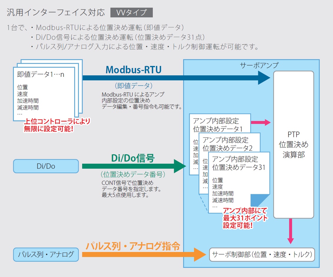 ■VVタイプ:Modbus-RTU、Di/Do信号による31点の位置決めデータ内蔵、パルス列・アナログ指令による位置・速度・トルク 制御運転ができます。