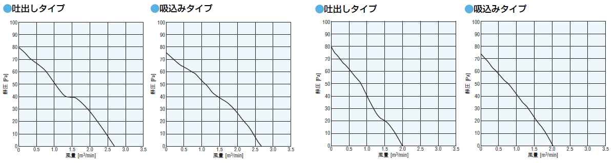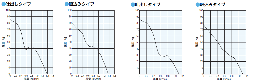 | 風向き | 品名 | 色 | 外形寸法 | アラーム | 電圧 | 電流 | 入力 | 回転速度 | 最大風量 | 最大静圧 | 騒音レベル |