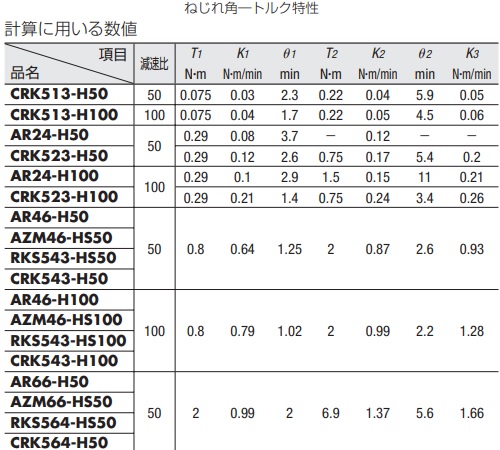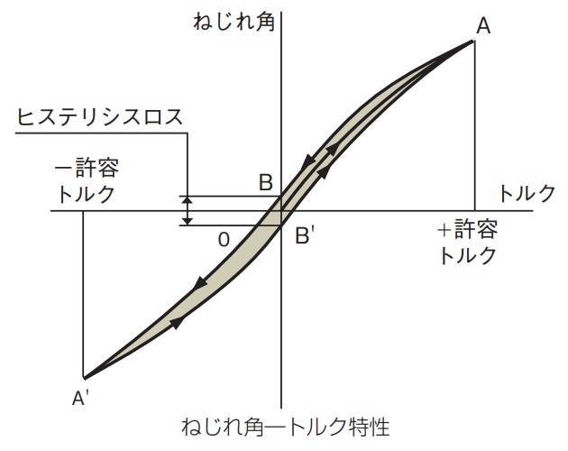 これは無負荷条件での値(ギヤ部参考値)です。 しかし実際の用途 においては、必ず摩擦負荷が発生し、摩擦負荷に応じた変位を生 じます。摩擦負荷が一定の場合、一方向運転では変位は一定ですが、 正逆両方向から運転をおこなうときは往復で2倍の変位を生じま す。 その変位は、次のトルク―ねじれ特性から推測することがで きます。