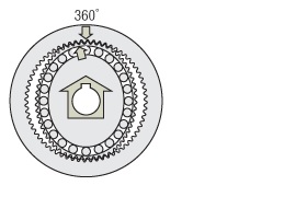 ウェーブ・ジェネレータが1回転すると、フレクスプラインは サーキュラ・スプラインより歯数が2枚少ないため、ウェー ブ・ジェネレータの回転方向とは逆方向へ、すなわち反時計 方向へ、歯数差2枚分だけ移動します。この動きを出力として 取り出し、減速しています。 |