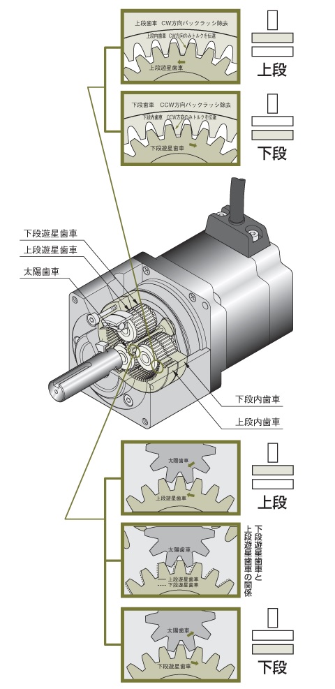 バックラッシ除去機構は内歯車と遊星歯車をそれぞれ上下2段に配置し、内歯車を円周方向にひねっています。