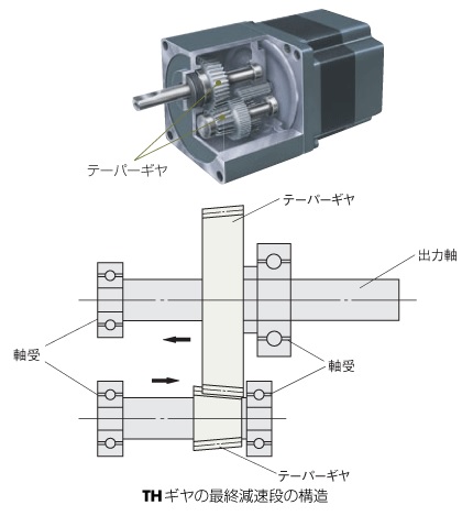 THギヤは平歯車減速機の出力段とそれに噛み合う歯車にテーパーギヤを採用しています。