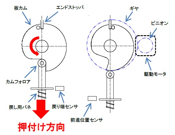| 動作方式 | 板カム 直動式 (バネ戻し) | 板カム 直動式 (バネ戻し) |