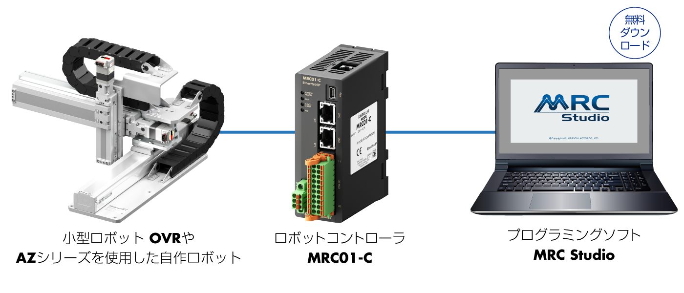※2 MRC01-CとAZシリーズのドライバ間は、RS-485通信で制御しています。ロボットコントローラ MRC01-Cとプログラミングソフト MRC Studioでかんたんセットアップ