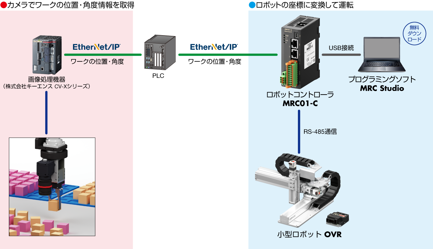 ロボットコントローラ MRC01-C は、カメラで取得したワークの位置や角度の情報を使って、ロボットを運転させるための便利な機能を搭載しています。