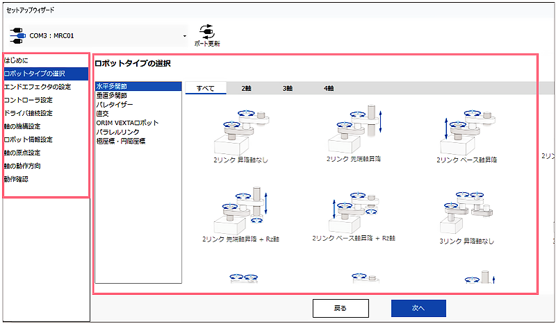 ロボットタイプの選択や機構情報の入力など、一連の初期設定をウィザード形式でおこなえます。イラストを見ながらガイダンスの指示に従って設定することで、初めてでも短時間でロボットの初期設定ができます。小型ロボットOVRは機構情報があらかじめ入力されているため、より簡単に初期設定をおこなえます。